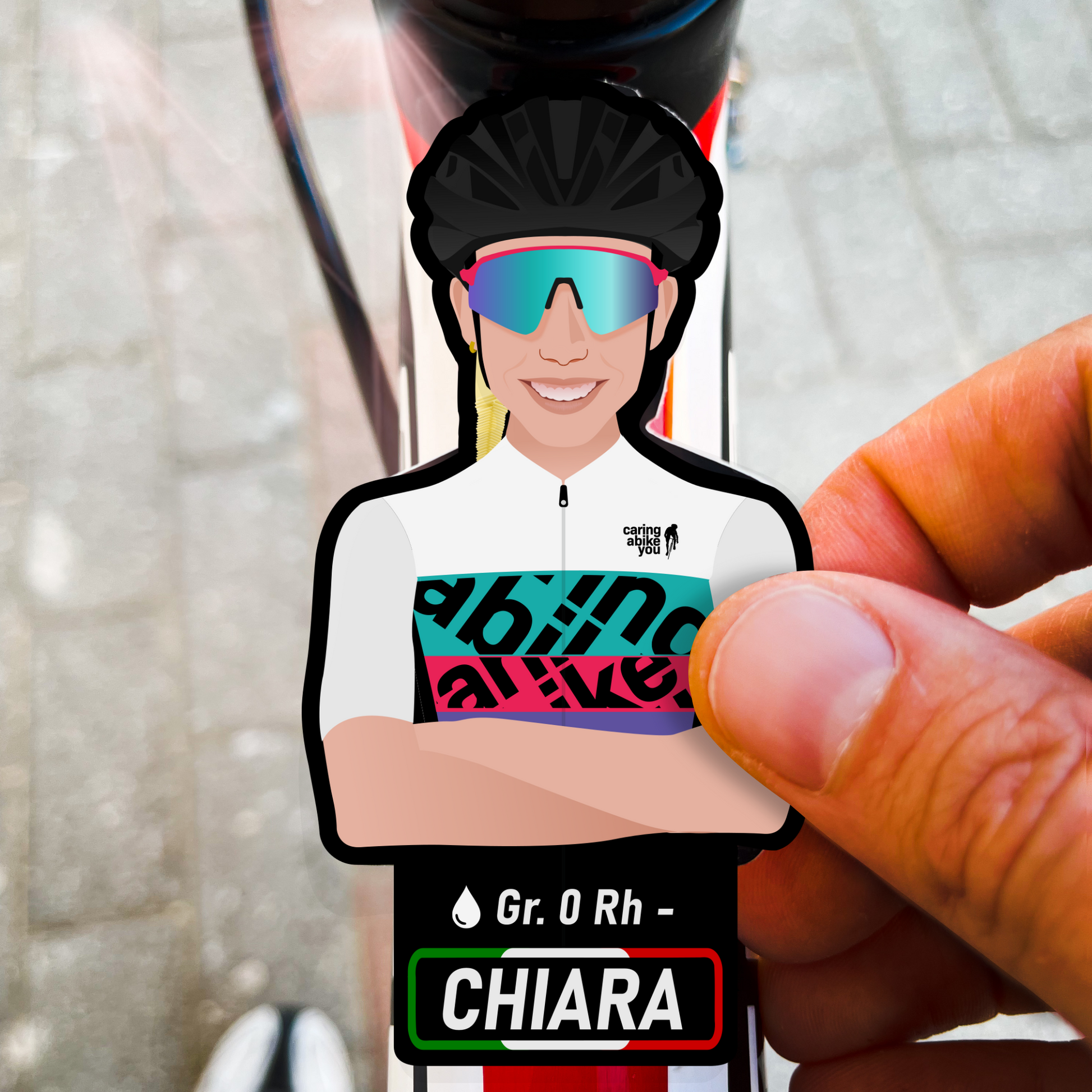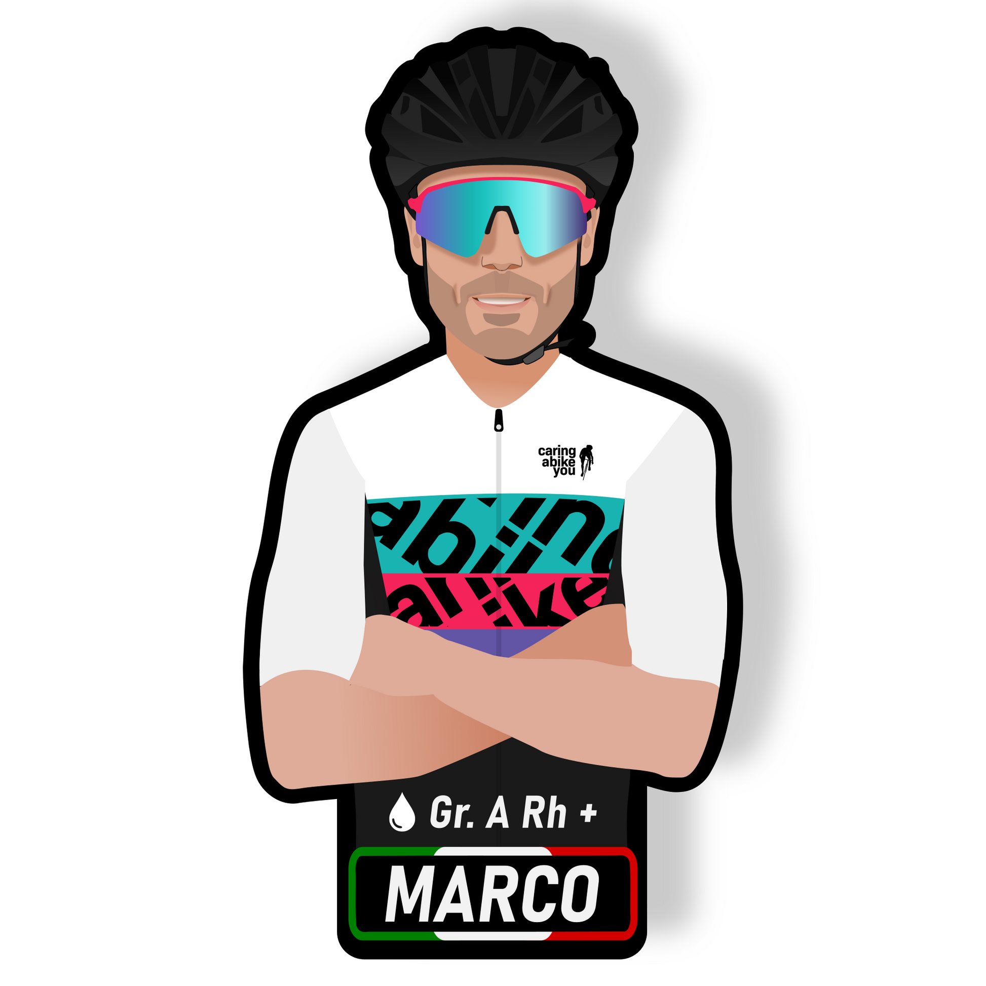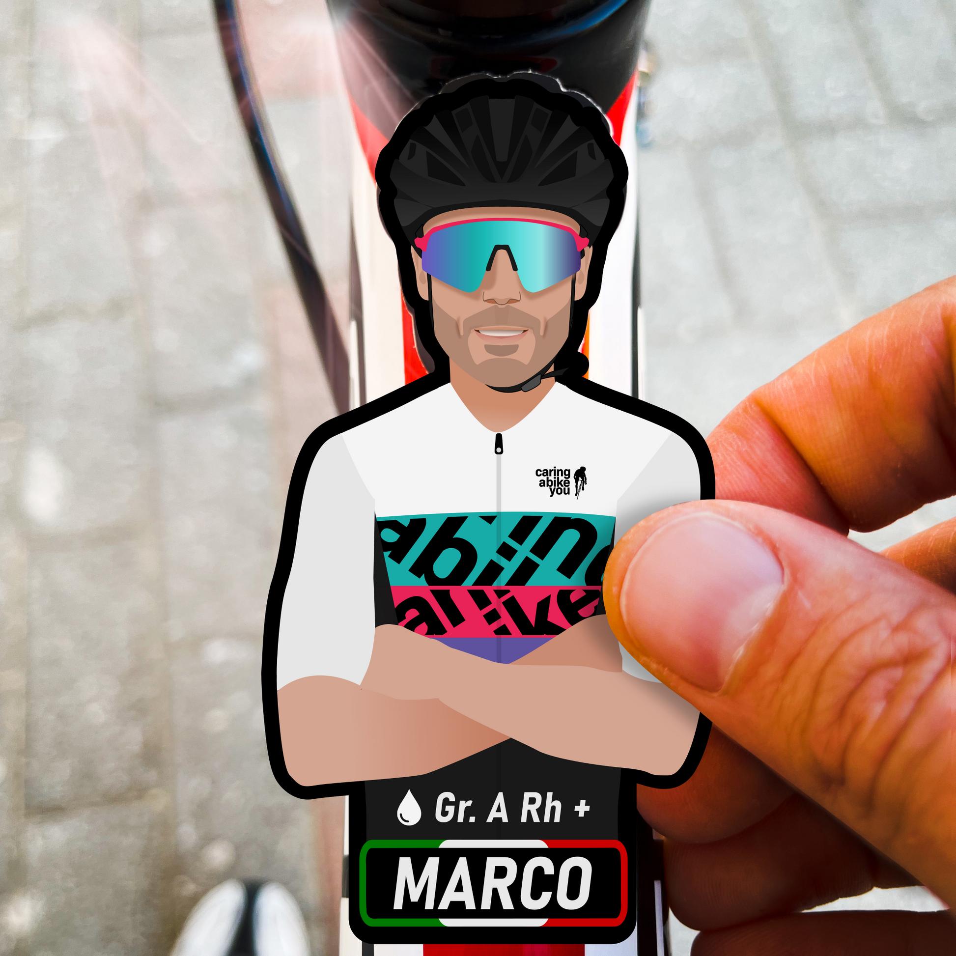 Dalla tua foto, con il tuo casco ed occhiali, ti disegneremo con la nostra mitica maglia "La Otto" e realizzeremo gli adesivi che potrai applicare a qualunque cosa vorrai per personalizzarla in modo unico!